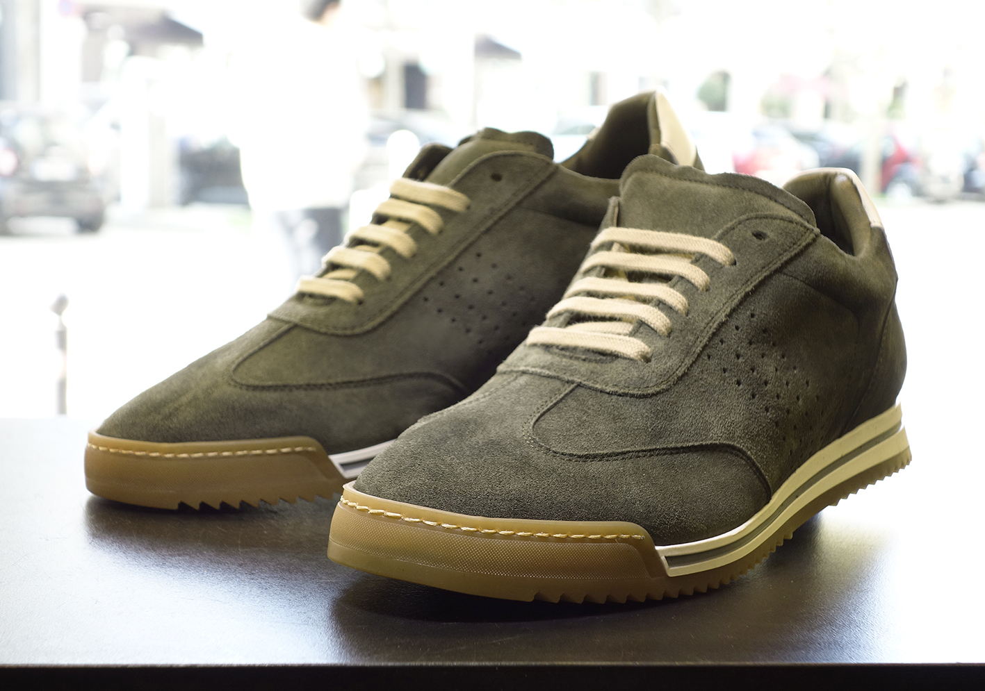 Tennis shoes, in khaki suede, rubber sole.