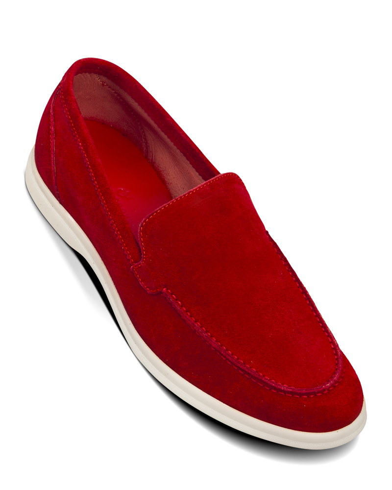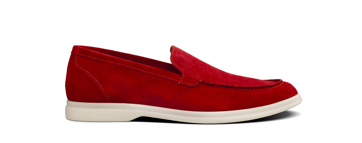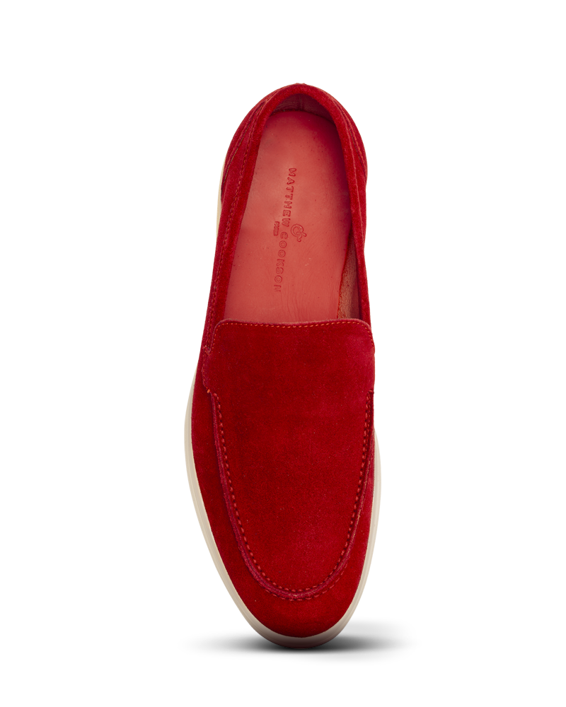 The summer loafer, Capri in unlined red suede calfskin is mounted on a light and very flexible rubber sole.